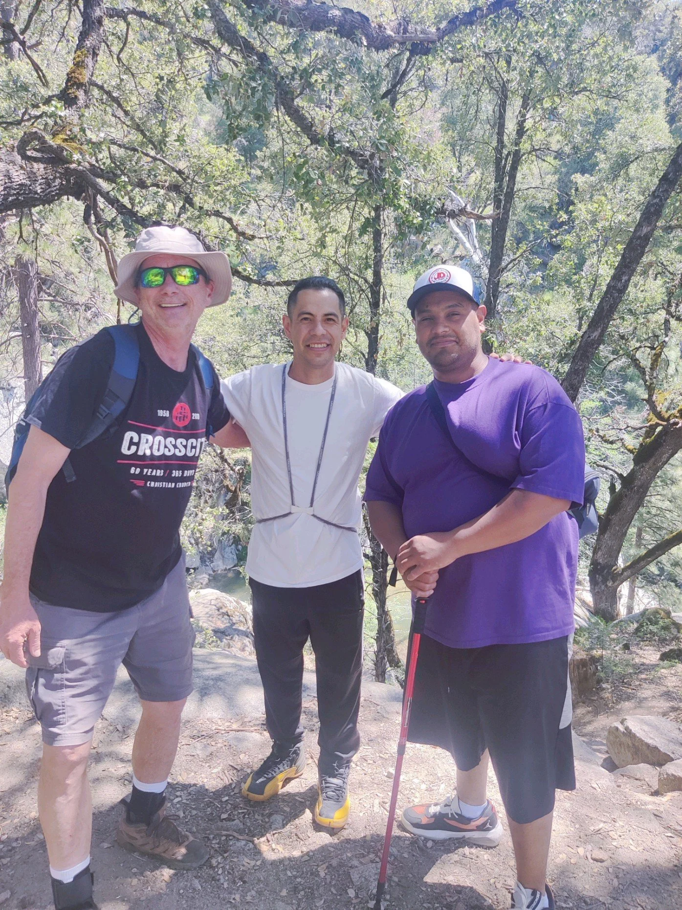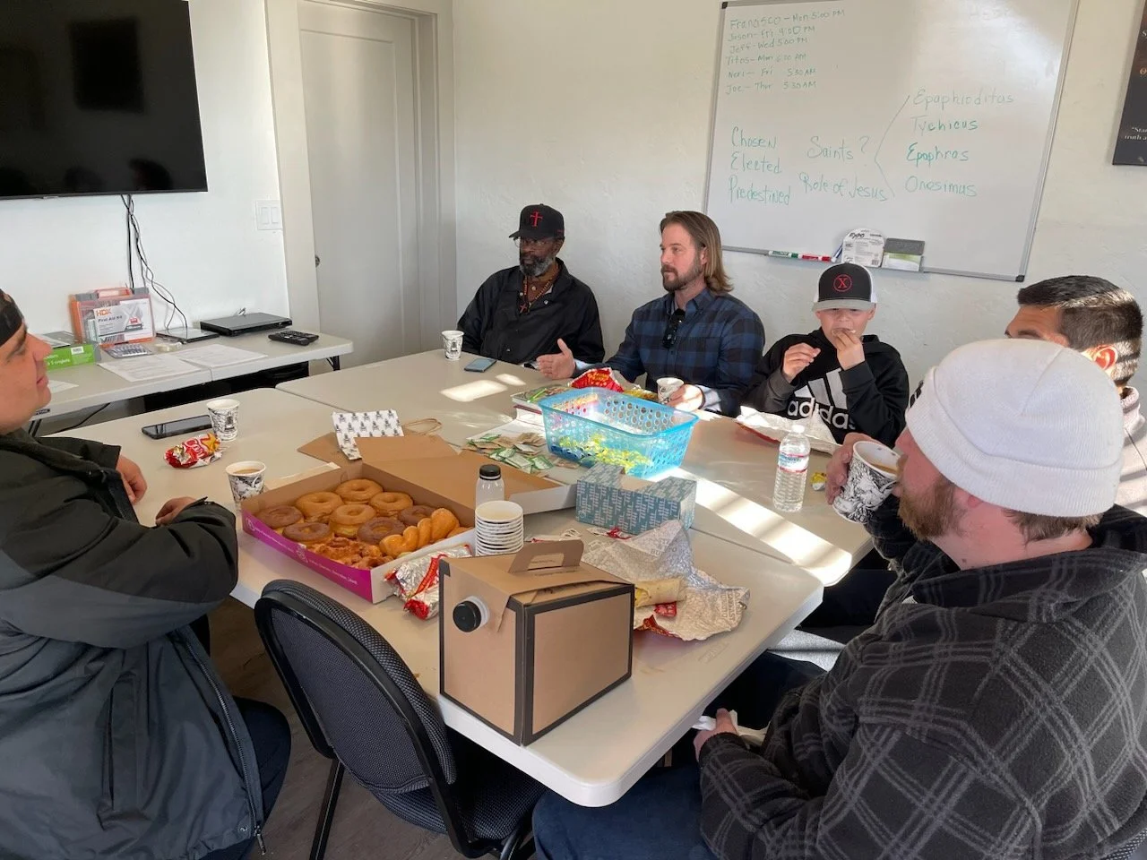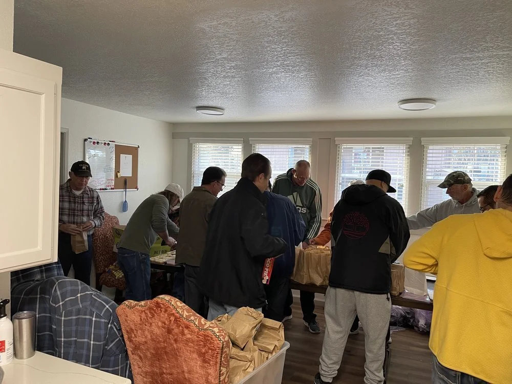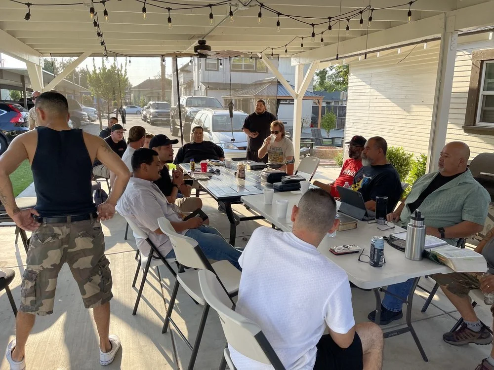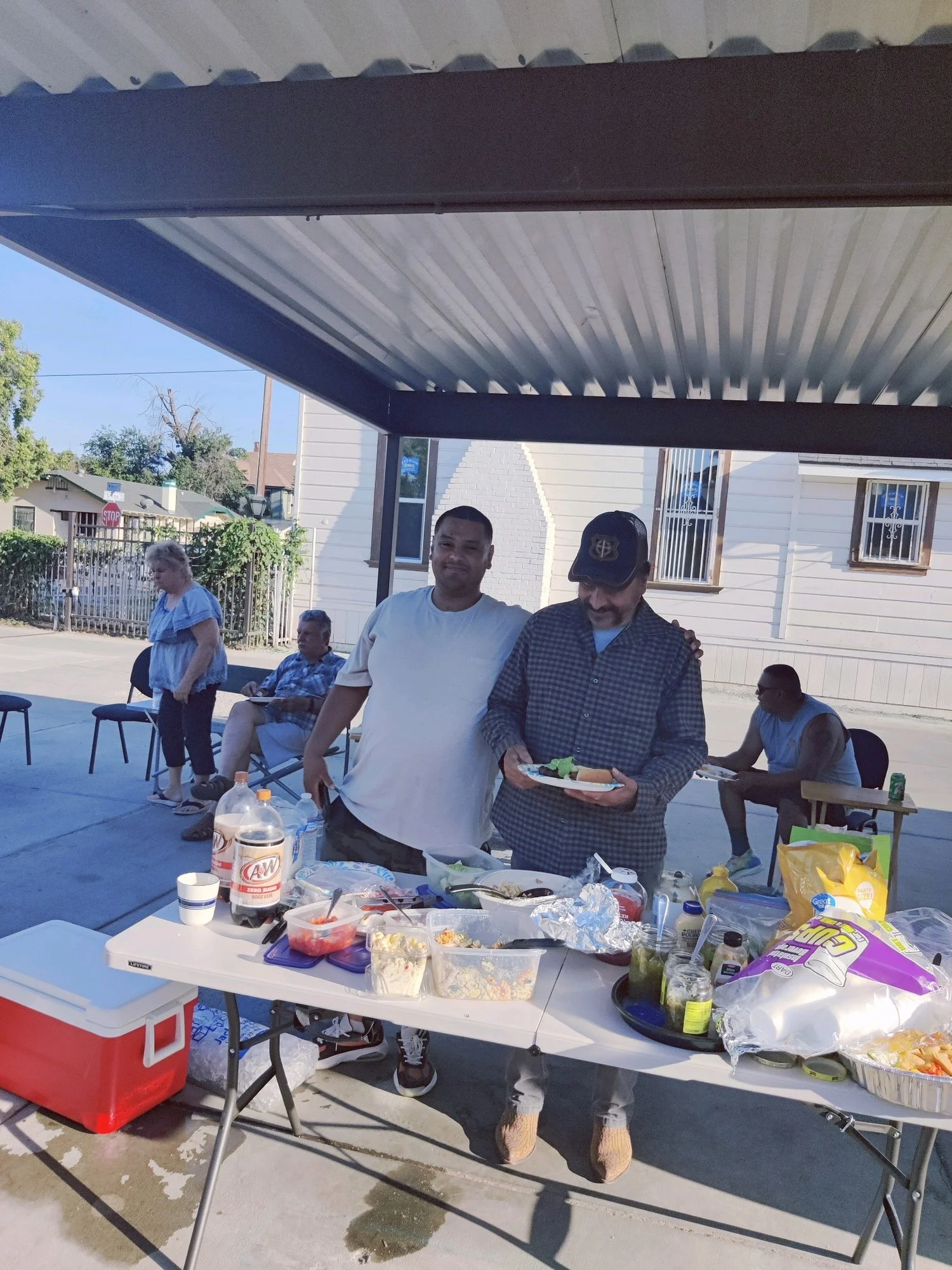 Image of two residential white buildings with shingle roofs, separated by a driveway. A sign in the foreground displays a Bible verse from Revelation 3:20 and mentions "Next Door Ministries," with an address in Fresno, CA. There are plants and a smal