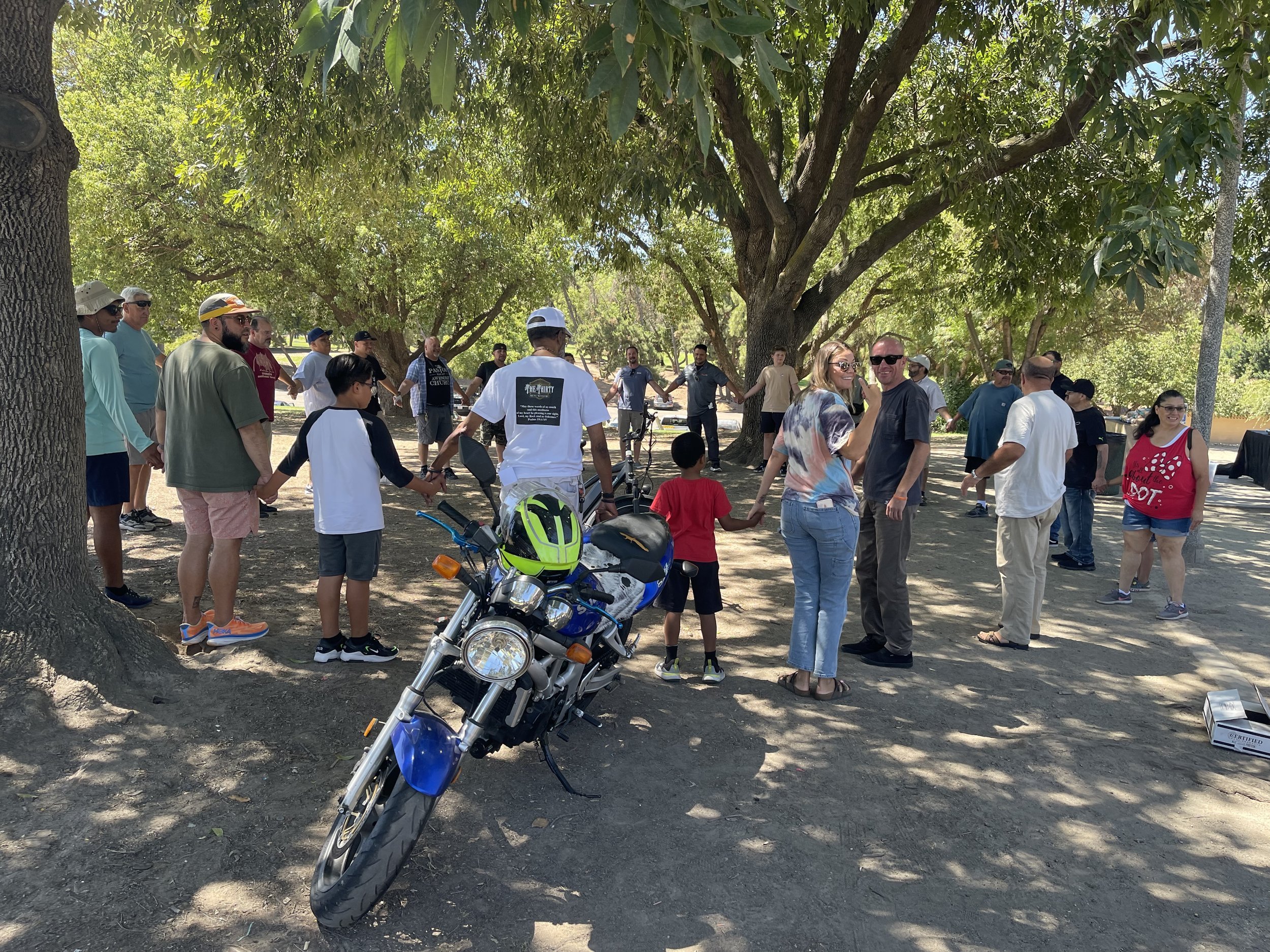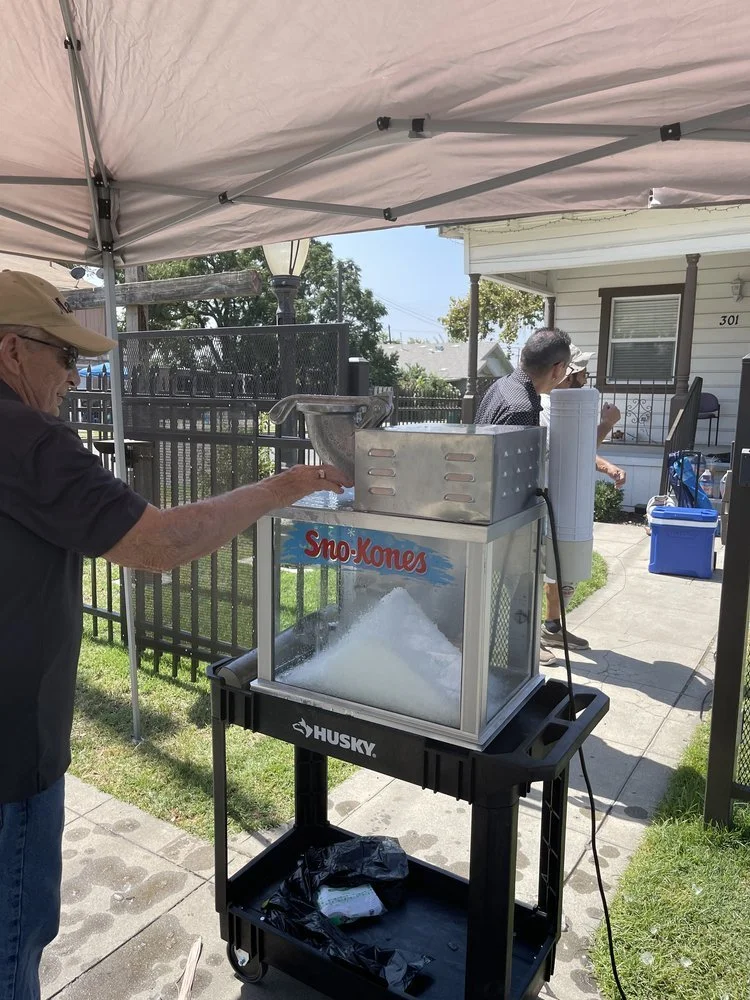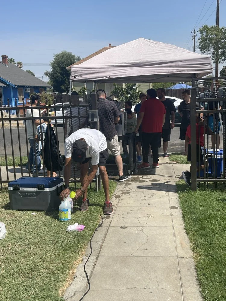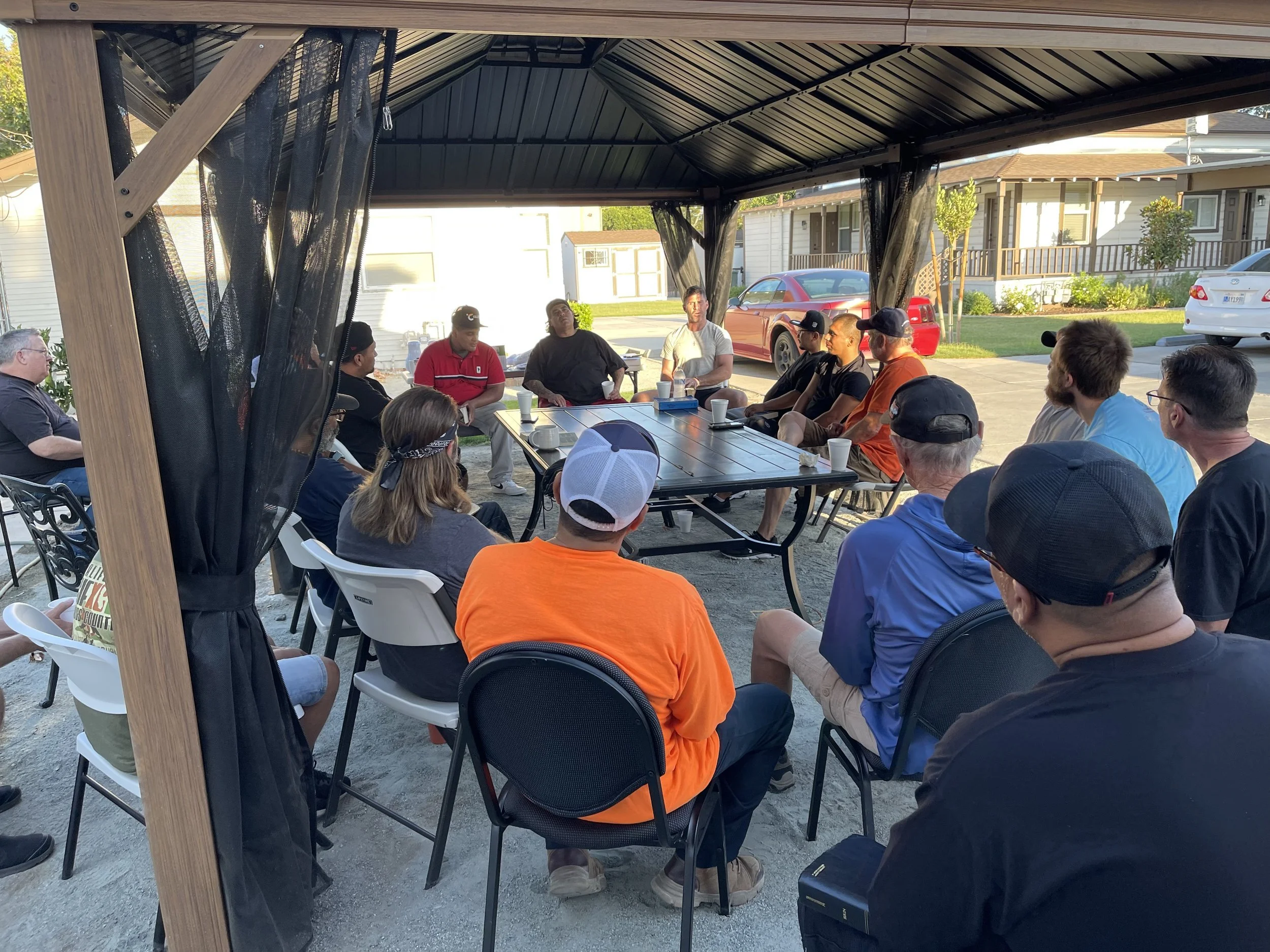Outdoor event or gathering at a residential house with people talking on a patio and lawn