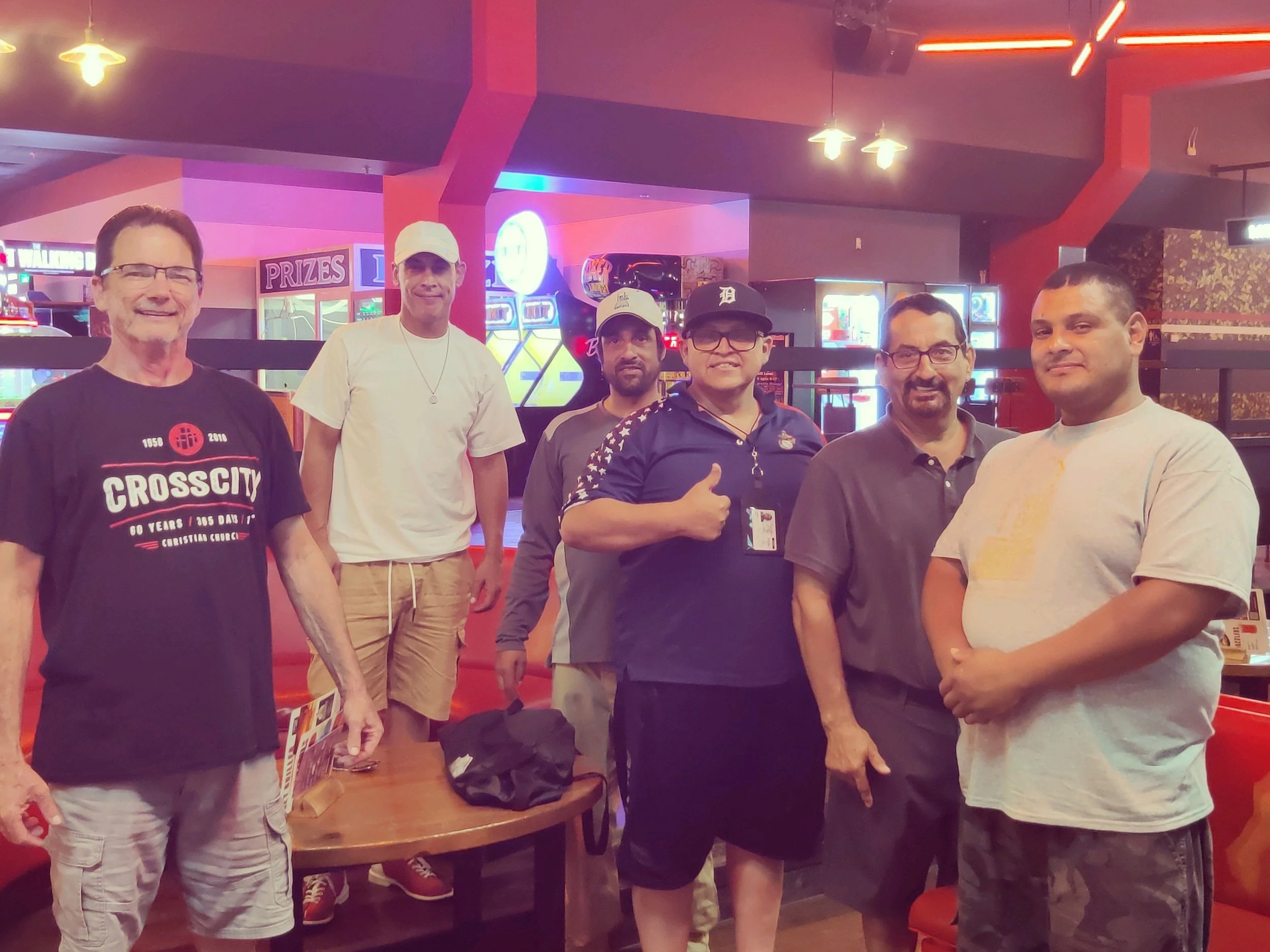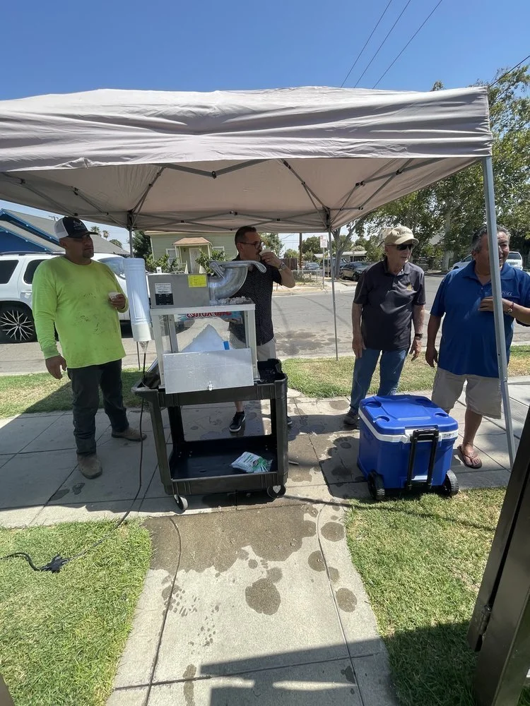 Group of four adults standing under a tent at an outdoor event, with two wearing black shirts and sunglasses, one in a floral dress, and another in a purple polo. White balloons are visible above.
