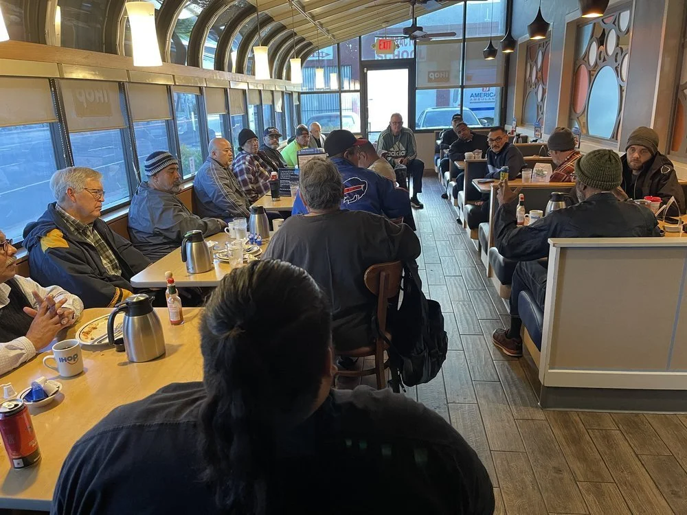 Group of people in conversation outdoors, one man wearing glasses and patterned shirt, another in a blue suit.