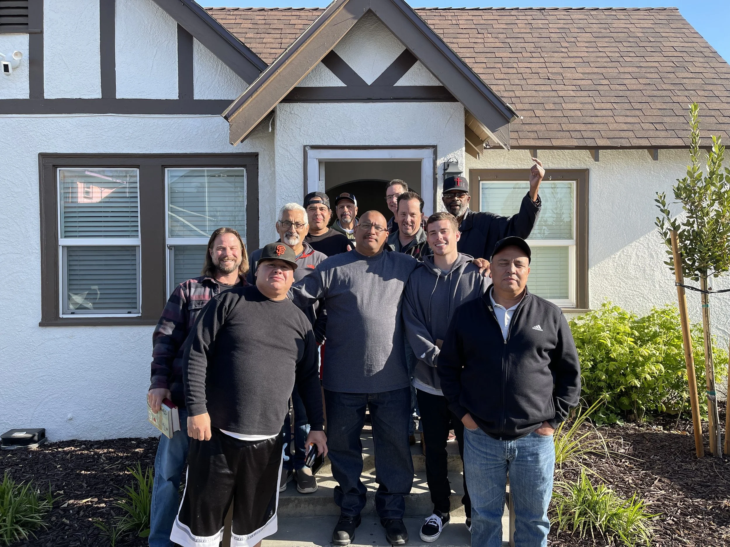 Group of people at a ribbon-cutting ceremony in front of a house, holding a red ribbon. A man in a blue suit prepares to cut the ribbon, smiling. Others, dressed in casual attire, stand nearby holding the ribbon.